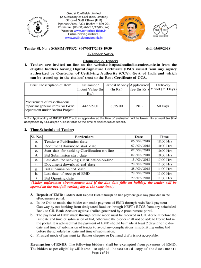Central Coalfields Limited (A Subsidiary of Coal India Limited) Office of Staff Officer (MM) Piparwar Area, P.O.: Bachra 829 201 Phone No. (06531)266611/12/05(Fax) Website: www.centralcoalfields.in