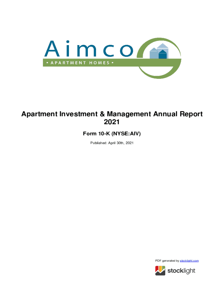 This document serves as the Annual Report for Apartment Investment and Management Company for the fiscal year ended December 31, 2020, as filed with the SEC. It details the company\'s financial performance, executive officers, board of directors, corporate governance practices, and other mandatory disclosures as per the Securities Exchange Act of 1934. The report also includes information about the company\'s business separation into two public entities.