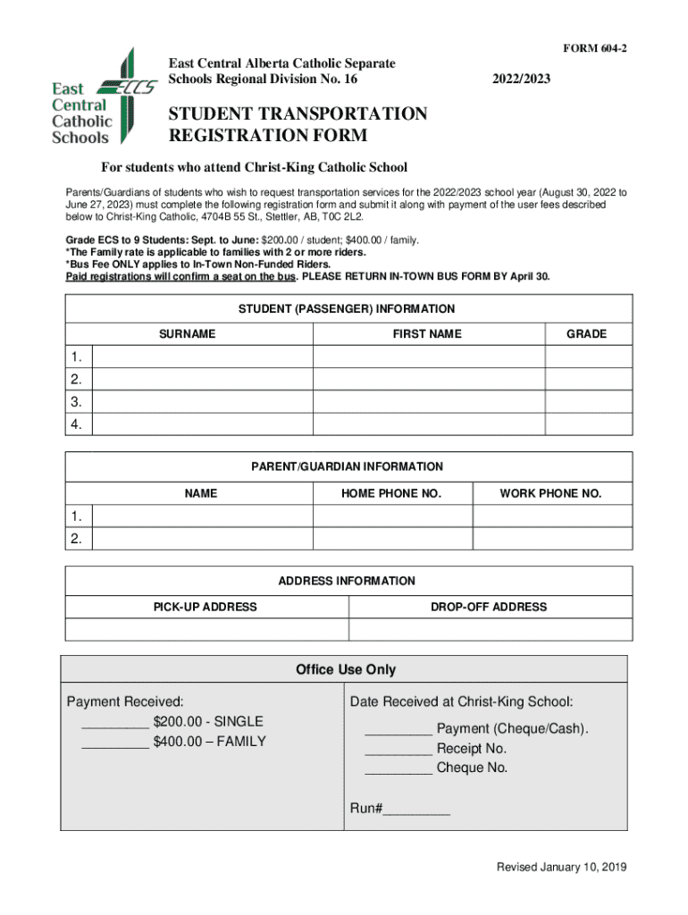 FORM 6042East Central Alberta Catholic Separate Schools Regional Division No. 162022/2023STUDENT TRANSPORTATION REGISTRATION FORM For students who attend ChristKing Catholic School Parents/Guardians
