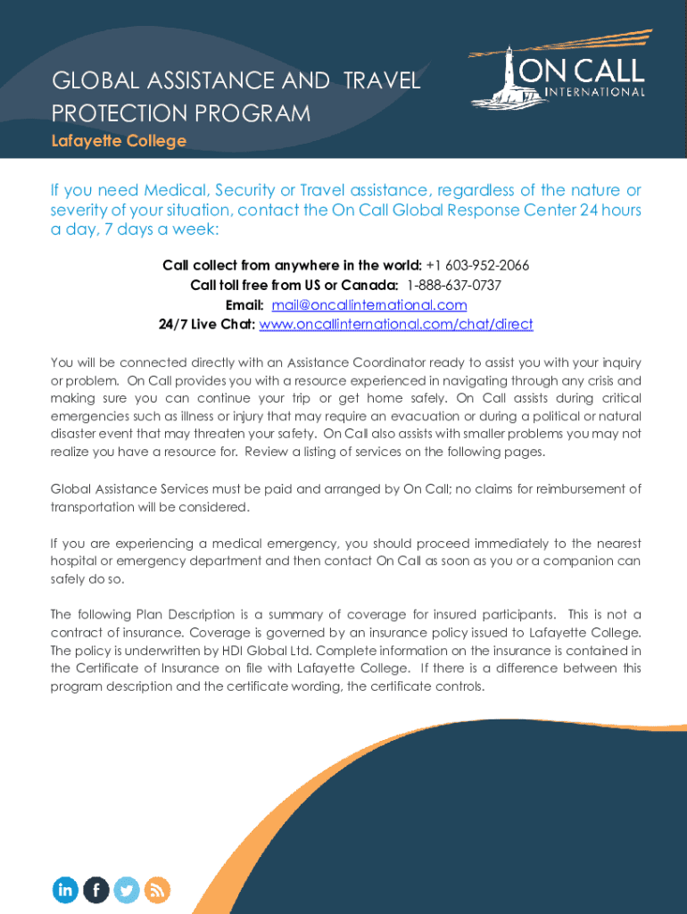 GLOBAL ASSISTANCE AND TRAVEL PROTECTION PROGRAM Lafayette College If you need Medical, Security or Travel assistance, regardless of the nature or severity of your situation, contact the On Call Global
