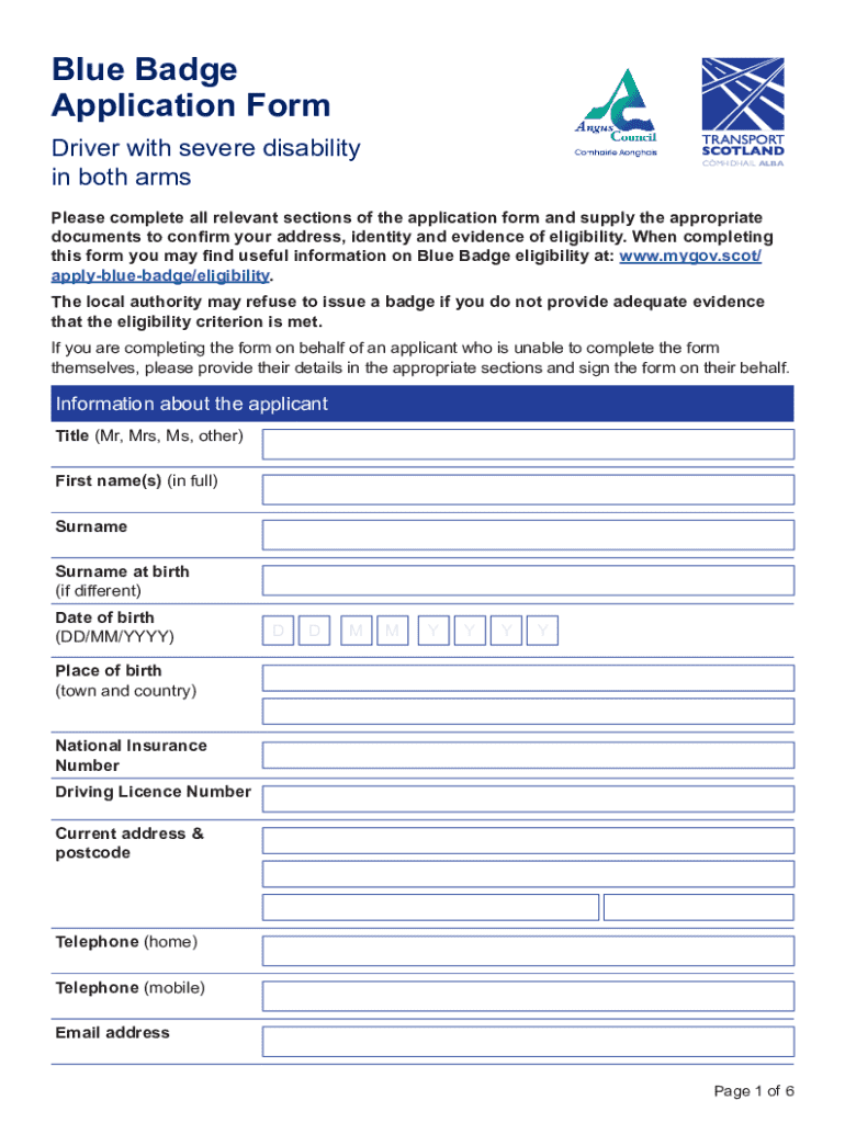 This application form is intended for individuals with severe disabilities in both arms who wish to apply for a Blue Badge. The form requires personal details, proofs of identity, address verification, and evidence that the applicant meets the eligibility criteria outlined for the Blue Badge scheme. It includes information on how to submit the application and necessary documentation.