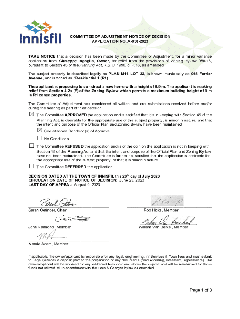 COMMITTEE OF ADJUSTMENT NOTICE OF DECISION APPLICATION NO. A0382023TAKE NOTICE that a decision has been made by the Committee of Adjustment, for a minor variance application from Giuseppe Ingoglia,