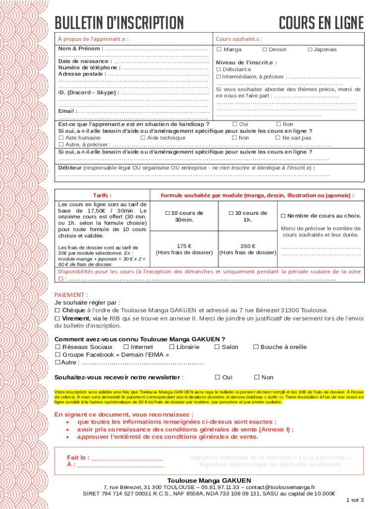 BULLETIN DINSCRIPTIONCours en ligne propos de lapprenant.e :Cours souhait.s :Nom & Prnom : ... Manga Dessin Japonais Date de naissance : ............. Niveau de linscrit.e : Numro de tlphone : Dbutant.e