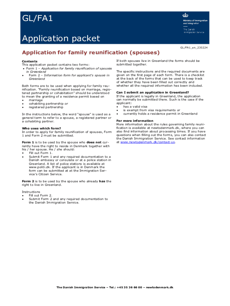 GL/FA1 Application packet Application for family reunification (spouses) Contents This application packet contains two forms: Form 1 Application for family reunification of spouses in Greenland Form