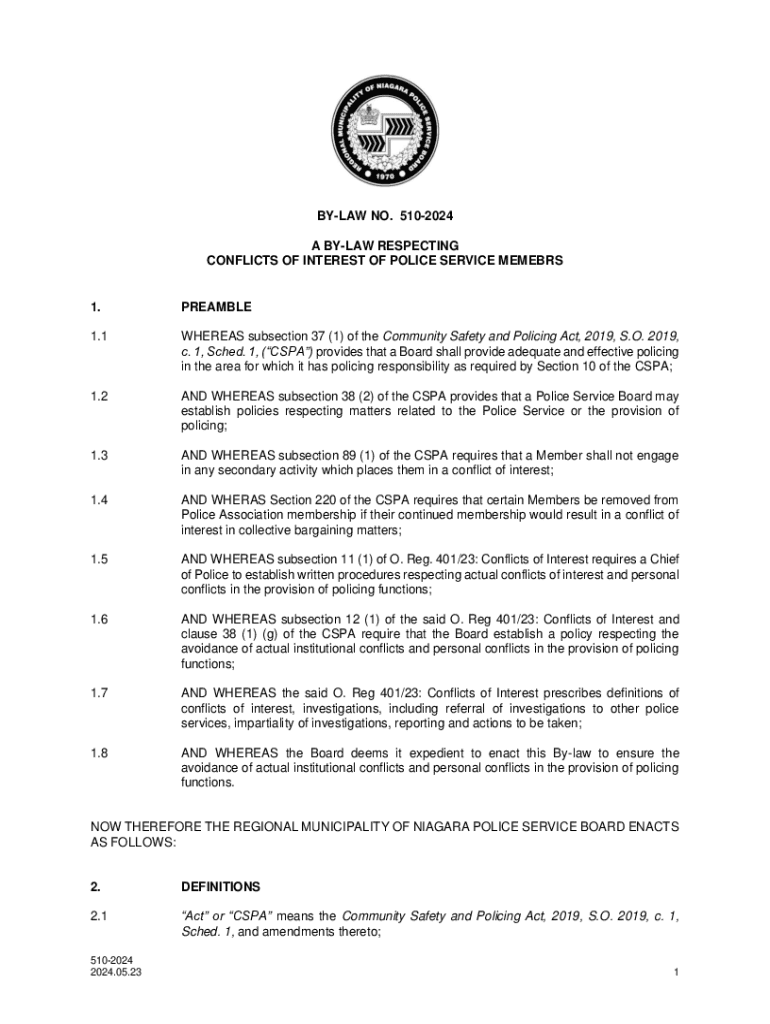 This by-law establishes procedures and policies to avoid and address conflicts of interest among members of the Niagara Regional Police Service, ensuring impartial and fair policing services as mandated by the Community Safety and Policing Act.