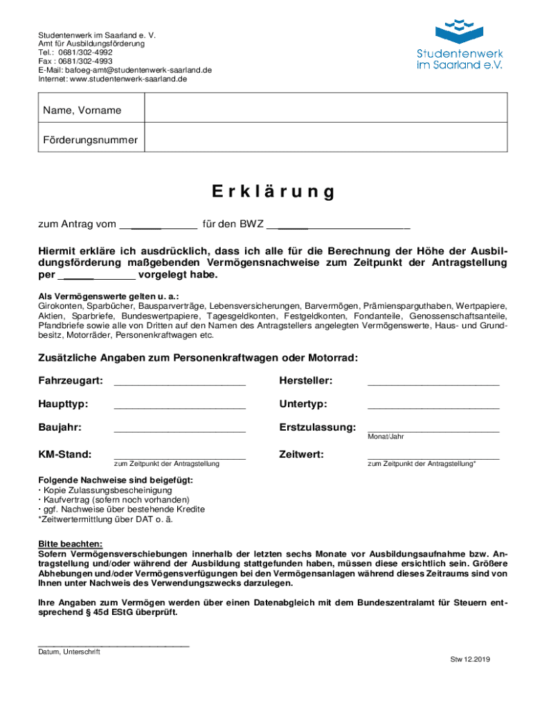 Studentenwerk im Saarland e. V. Amt fr Ausbildungsfrderung Tel.: 0681/3024992 Fax : 0681/3024993 EMail: bafoegamt@studentenwerksaarland.de Internet: www.studentenwerksaarland.deName, Vorname FrderungsnummerErklrung