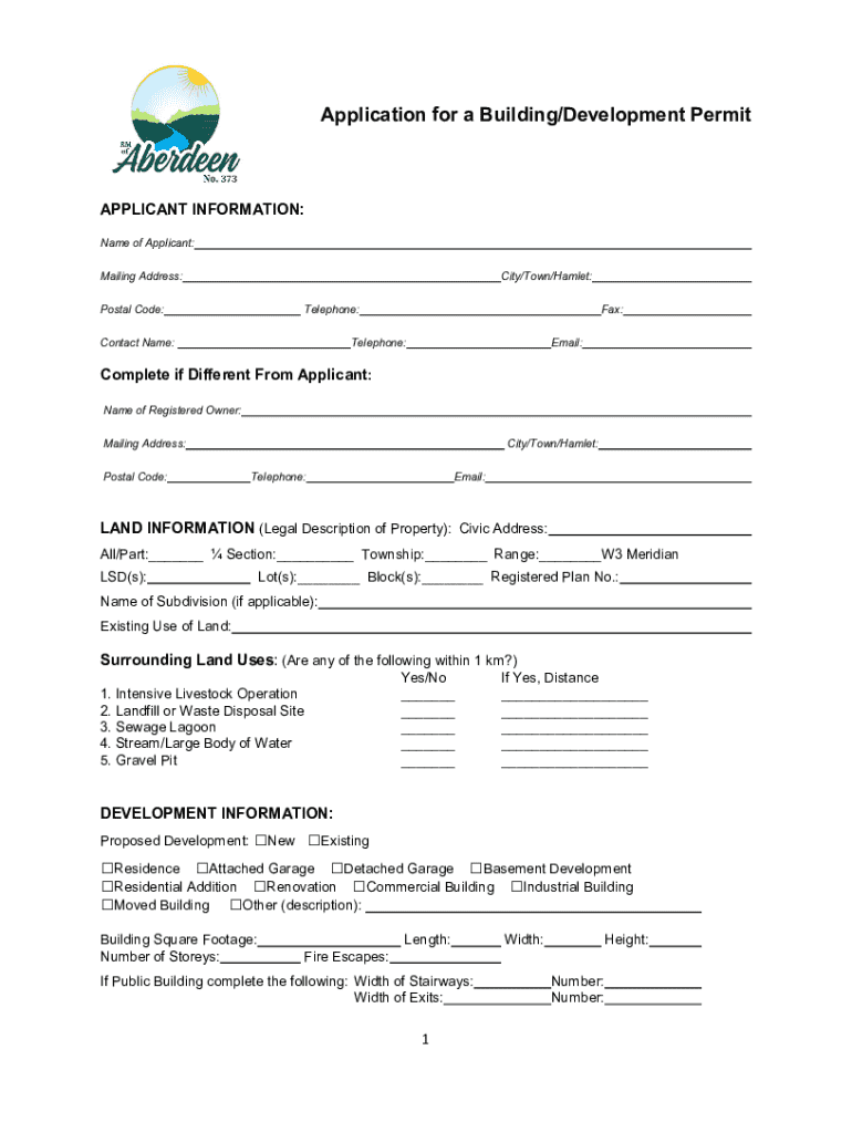 This document is an application form for individuals seeking permission to construct, erect, alter or reconstruct buildings within the jurisdiction of the R.M. of Aberdeen. It requires detailed information about the applicant, property, proposed development, and adherence to municipal bylaws and regulations.