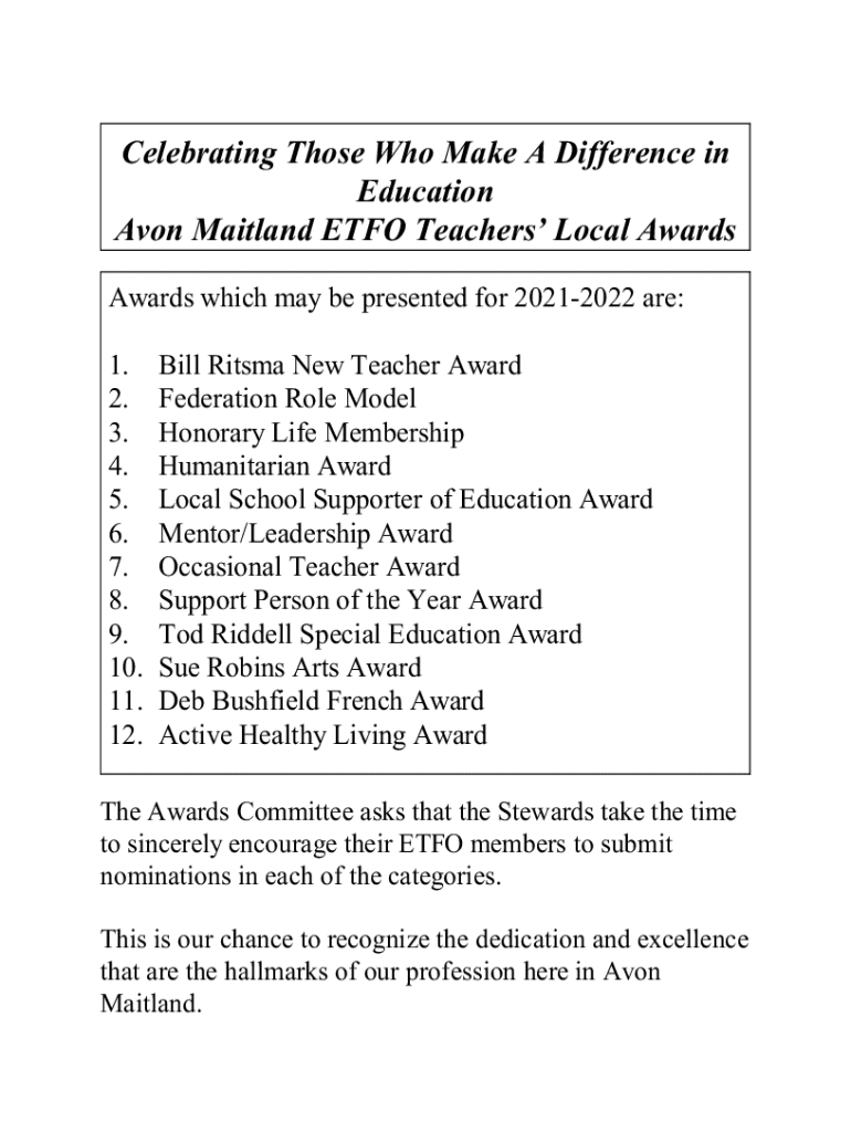 Celebrating Those Who Make A Difference in Education Avon Maitland ETFO Teachers Local Awards Awards which may be presented for 20212022 are: 1. 2. 3. 4. 5. 6. 7. 8. 9. 10. 11. 12.Bill Ritsma New