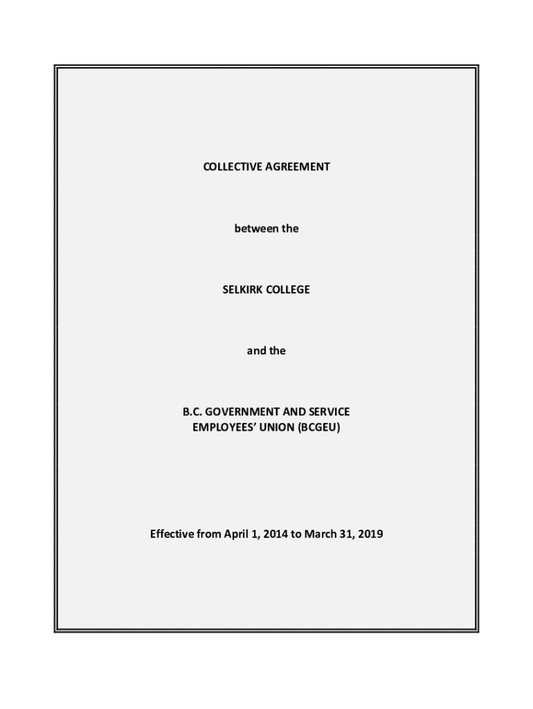 This document outlines the collective bargaining agreement between Selkirk College and the British Columbia Government and Service Employees\' Union (BCGEU) covering various terms of employment, rights of employees, salary scales, benefits, and working conditions from April 1, 2014 to March 31, 2019.