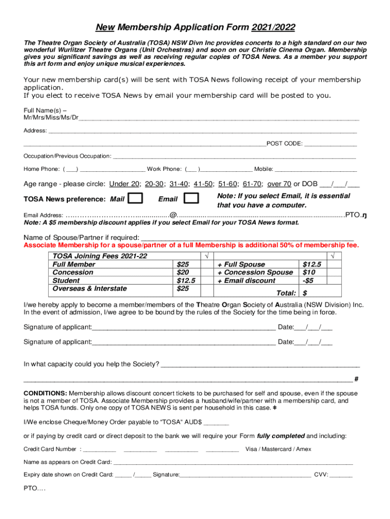 This form is for new members applying to join the Theatre Organ Society of Australia (TOSA) for the 2021/2022 period. Membership offers benefits including savings on concert tickets and subscriptions to TOSA News. The application process includes providing personal information and selecting preferred communication methods.