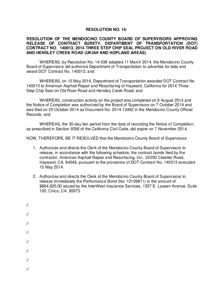 This resolution by the Mendocino County Board of Supervisors authorizes the release of contract surety for DOT Contract No. 140013, which pertains to the completion of the 2014 Three Step Chip Seal Project on Old River Road and Hensley Creek Road in the Ukiah and Hopland areas. The resolution details the approval of the release of performance and labor/materials bonds following the completion of construction and the expiration of the 30-day lien period.