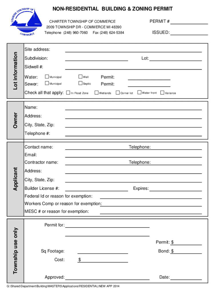 This document serves as an application for a Non-Residential Building & Zoning Permit within the Charter Township of Commerce. It includes relevant lot information, details about the property owner and applicant, project descriptions, construction materials, and compliance with local regulations and necessary signatures.