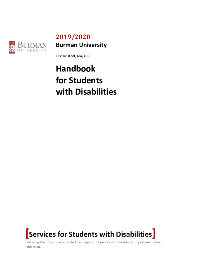 This handbook provides essential information and resources for students with disabilities at Burman University, detailing the support services offered by the Sakala Success Centre, processes for arranging accommodations, and guidelines for accessing funding and assistive resources to ensure their academic success.