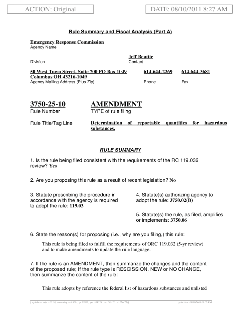 This document outlines the proposed amendments to the rule regarding reportable quantities for hazardous substances, ensuring compliance with ORC 119.032 for a five-year review and updating the language of the existing regulations. It incorporates federal regulations and assesses the fiscal impact and environmental considerations associated with the rule.