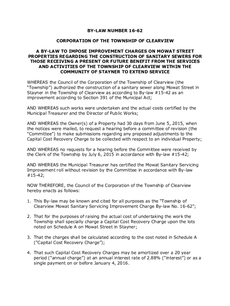 BYLAW NUMBER 1662 CORPORATION OF THE TOWNSHIP OF CLEARVIEW A BYLAW TO IMPOSE IMPROVEMENT CHARGES ON MOWAT STREET PROPERTIES REGARDING THE CONSTRUCTION OF SANITARY SEWERS FOR THOSE RECEIVING A PRESENT