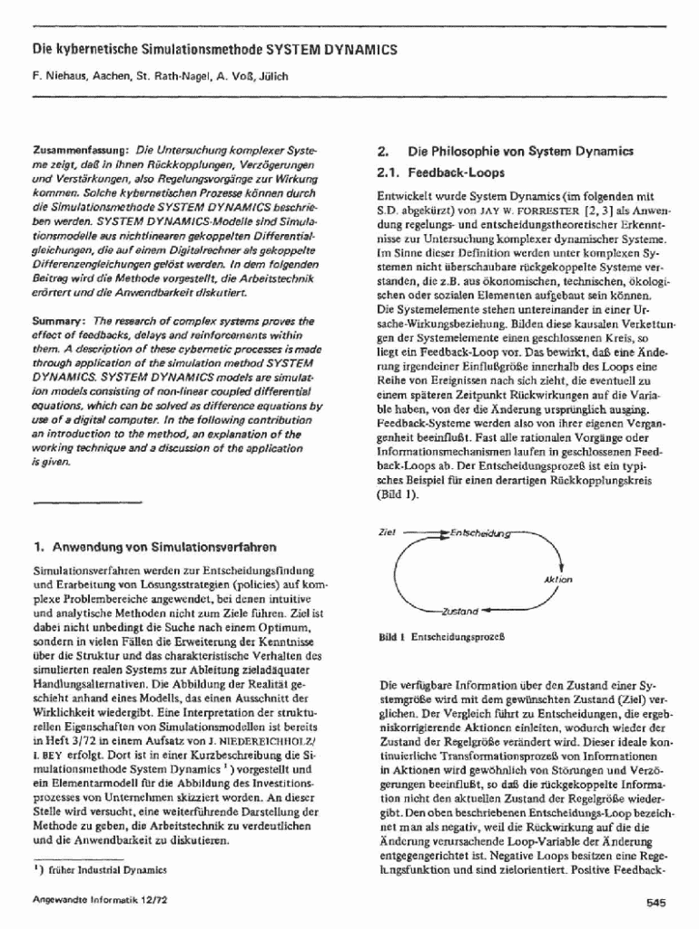 Die kybernetische Simulationsmethode SYSTEM DYNAMICS F. Niehaus. Aachen, St. AathNagel. A. VO, JlichZusammenfassung: Die Untersuchung komplexer Syste.me zeigt, da in ihnen Rckkopplungen, Verzgerungen