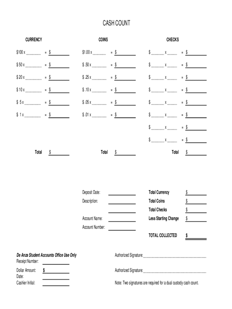 CASH COUNT CURRENCYCOINSCHECKS$100 x ___ $$1.00 x ___ $$ ___ x ___ $$ 50 x ___ $$ .50 x ___ $$ ___ x ___ $$ 20 x ___ $$ .25 x ___ $$ ___ x ___ $$ 10 x ___ $$ .10 x ___ $$ ___ x ___ $$ 5 x ___ $$ .05