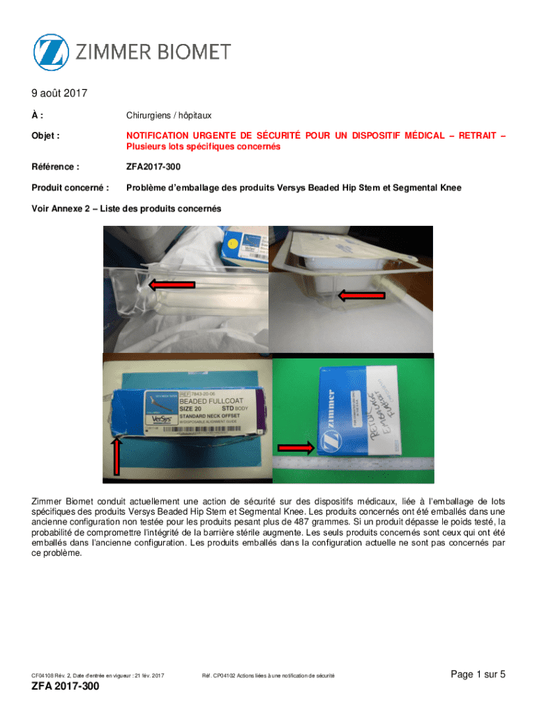 9 aot 2017 :Chirurgiens / hpitauxObjet :NOTIFICATION URGENTE DE SCURIT POUR UN DISPOSITIF MDICAL RETRAIT Plusieurs lots spcifiques concernsRfrence :ZFA2017300Produit concern :Problme demballage des