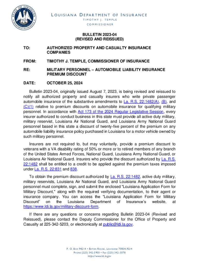 This bulletin from the Louisiana Department of Insurance informs authorized property and casualty insurers about changes to premium discounts for qualifying military personnel on automobile liability insurance. It outlines the requirements for active duty military and reservists, as well as options for veterans. The bulletin emphasizes the necessity of submitting a proper application to obtain the specified discounts.