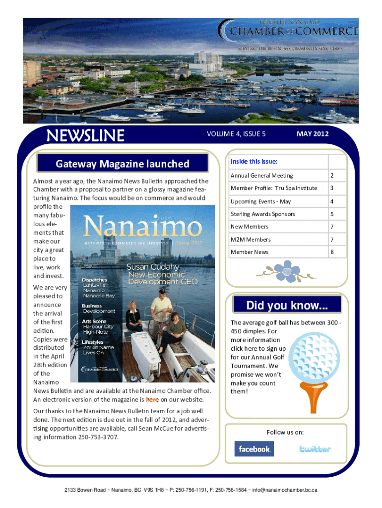 NEWSLINEVOLUME 4, ISSUE 5Gateway Magazine launched Almost a year ago, the Nanaimo News Bulle n approached the Chamber with a proposal to partner on a glossy magazine fea turing Nanaimo. The focus
