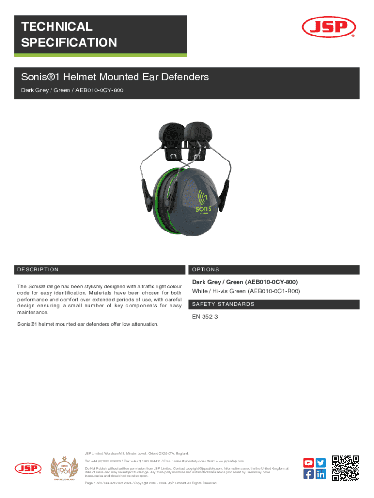This document provides a detailed technical specification for the Sonis®1 Helmet Mounted Ear Defenders, highlighting safety standards, materials used, performance features, and customization options. It outlines the design, comfort, hygiene, and compatibility with various helmet systems. The ear defenders are suitable for various industries and applications.