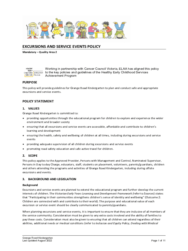 EXCURSIONS AND SERVICE EVENTS POLICY Mandatory Quality Area 2Working in partnership with Cancer Council Victoria, ELAA has aligned this policy to the key policies and guidelines of the Healthy Early