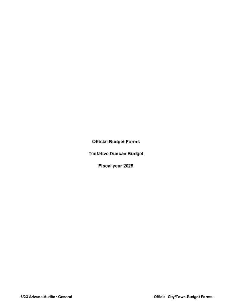 Official Budget Forms Tentative Duncan Budget Fiscal year 20256/23 Arizona Auditor GeneralOfficial City/Town Budget FormsTentative Duncan Budget Table of Contents Fiscal year 2025Resolution for the