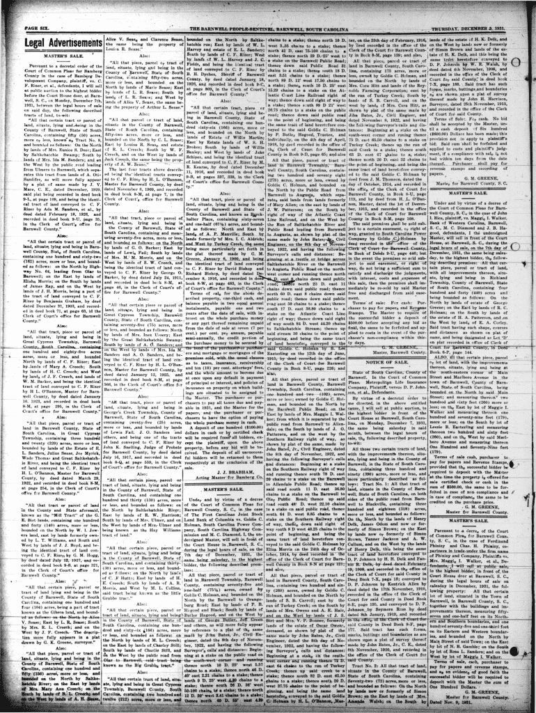 This document contains legal advertisements for multiple property sales to be held in Barnwell County, South Carolina, under various deeds and authoritative orders. It describes the properties, their boundaries, and terms of sale, including cash requirements and previous conveyances.