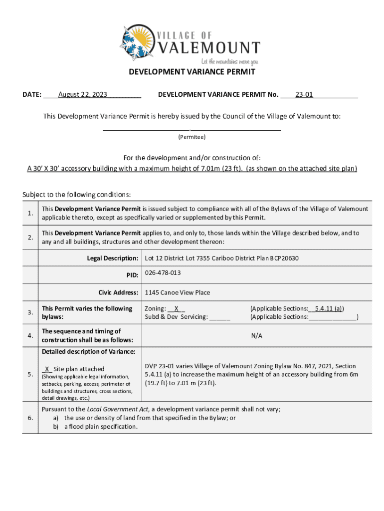DEVELOPMENT VARIANCE PERMIT DATE: ___August 22, 2023___DEVELOPMENT VARIANCE PERMIT No. ___2301___This Development Variance Permit is hereby issued by the Council of the Village of Valemount to: ___