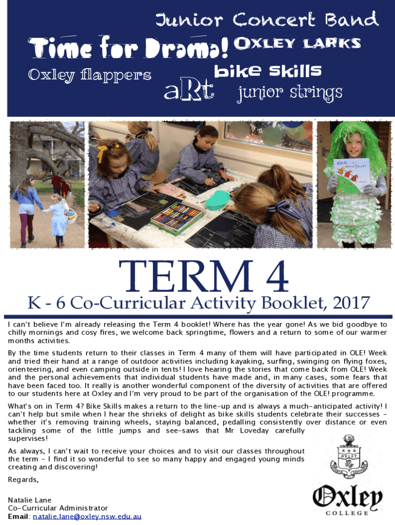 Junior Concert BandTime for Drama! Oxley flappersOxley larksbike skills junior stringsaRtTERM 4K 6 CoCurricular Activity Booklet, 2017 I cant believe Im already releasing the Term 4 booklet! Where