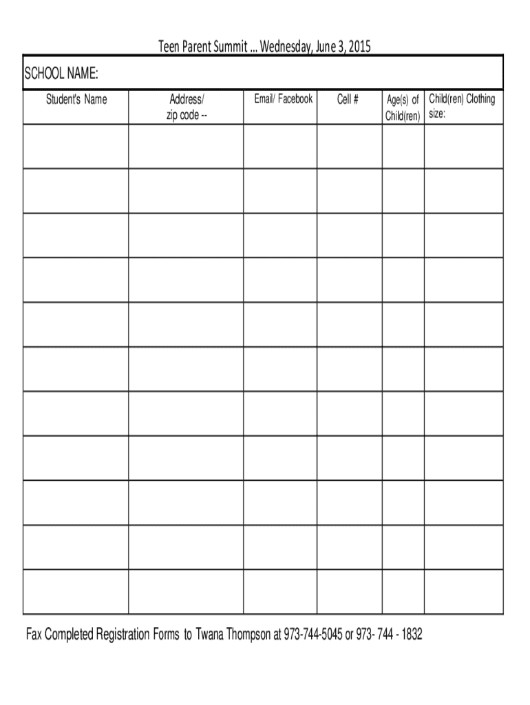 Teen Parent Summit Wednesday, June 3, 2015 SCHOOL NAME: Student\'s NameAddress/ zip code /Email/ FacebookCell #Age(s) of Child(ren)Fax Completed Registration Forms to Twana Thompson at 9737445045