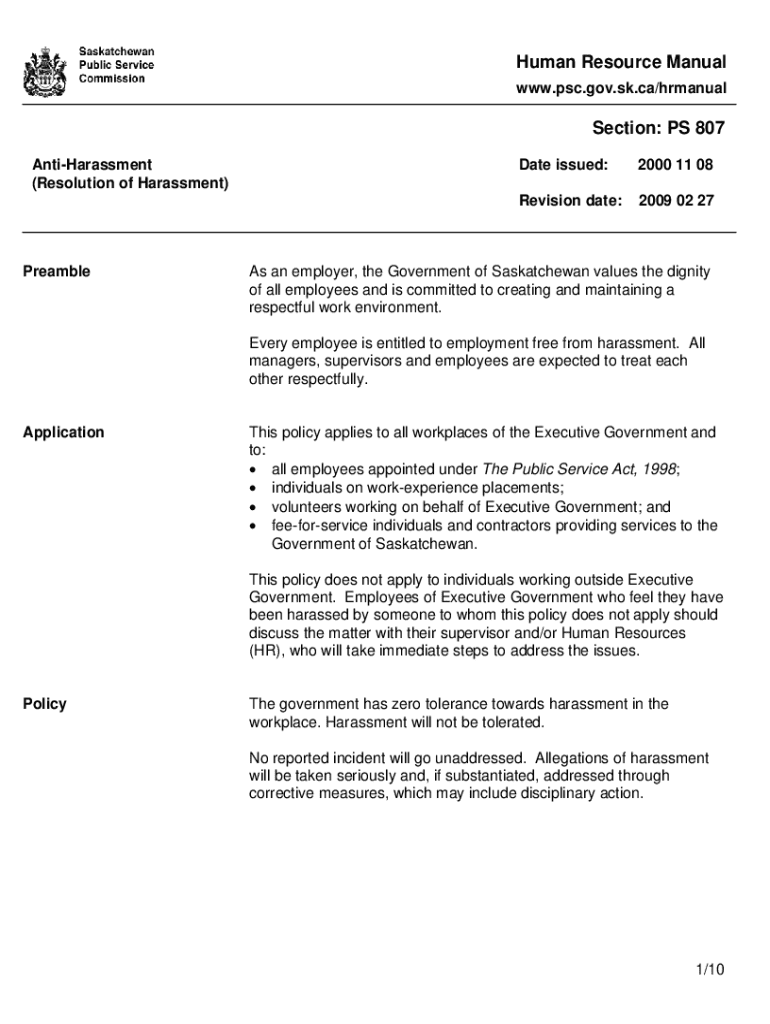 The Anti-Harassment Policy outlines the Government of Saskatchewan\'s commitment to providing a work environment free from harassment, detailing responsibilities, complaint processes, and definitions related to harassment in the workplace. It emphasizes zero tolerance towards harassment and delineates the roles of complainants, respondents, supervisors, and resource personnel in maintaining a respectful and safe workplace.