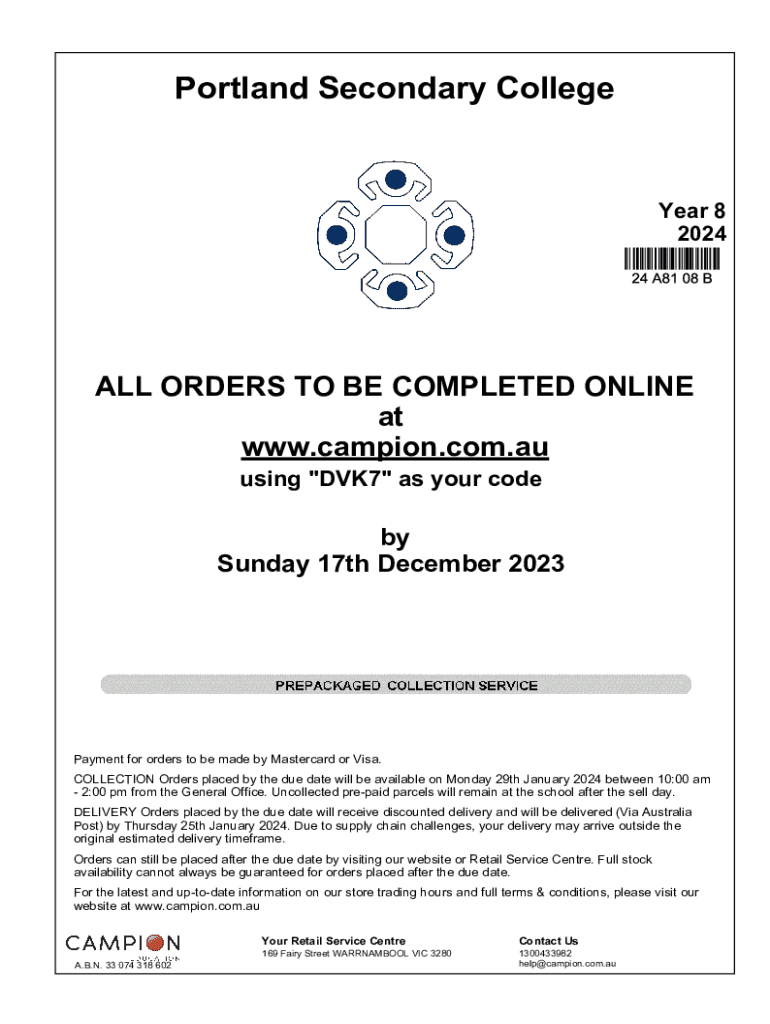 Portland Secondary CollegeYear 8 2024ALL ORDERS TO BE COMPLETED ONLINE at www.campion.com.au using \"DVK7\" as your codeby Sunday 17th December 2023Payment for orders to be made by Mastercard or Visa.