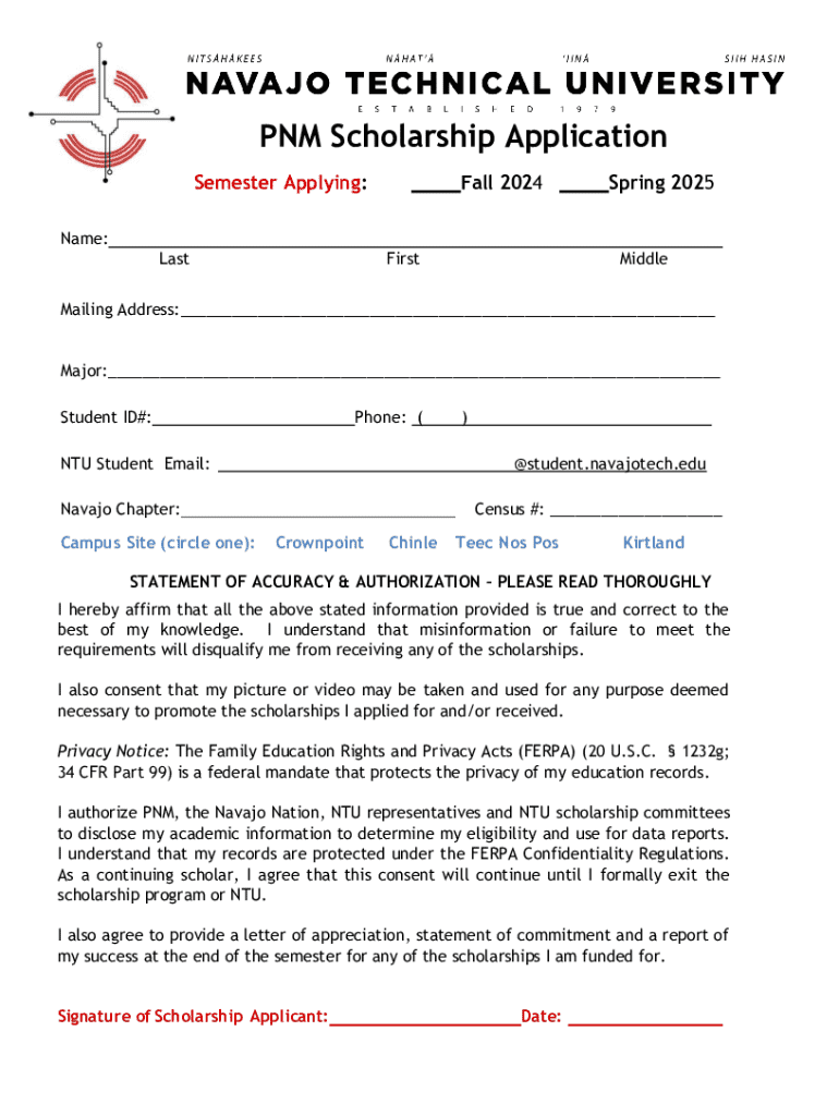 This document serves as an application form for scholarships offered by PNM for students applying for the Fall 2024 or Spring 2025 semesters. It includes sections for personal information, a statement of accuracy, privacy notice under FERPA, and a checklist of required documentation for submission. This application aims to gather essential information to determine eligibility for scholarships.