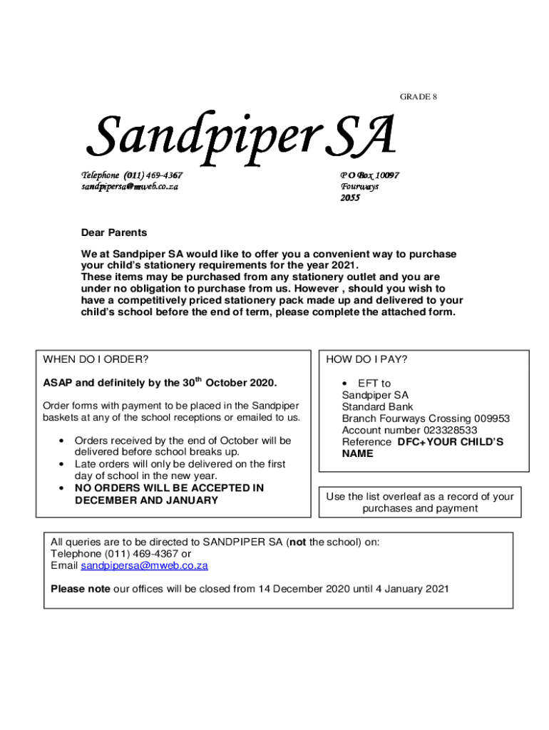 This document serves as an order form for parents to purchase stationery supplies for Grade 8 students at Dainfern College for the year 2021. It includes a detailed list of required items per subject, payment instructions, and deadlines for orders.
