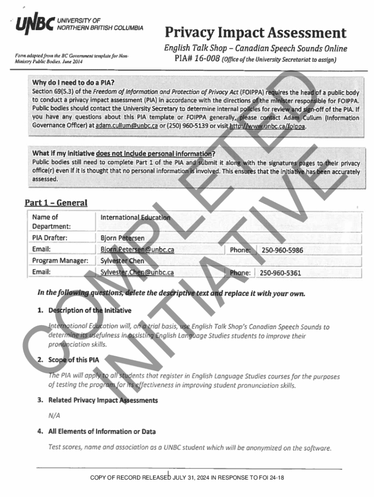 This document outlines the Privacy Impact Assessment (PIA) for the English Talk Shop initiative at the University of Northern British Columbia, focusing on the use of Canadian Speech Sounds to improve pronunciation skills of English Language Studies students. It details the requirements for conducting PIAs under the Freedom of Information and Protection of Privacy Act (FOIPPA), the scope of the assessment, data management, storage, and privacy risk mitigation strategies.