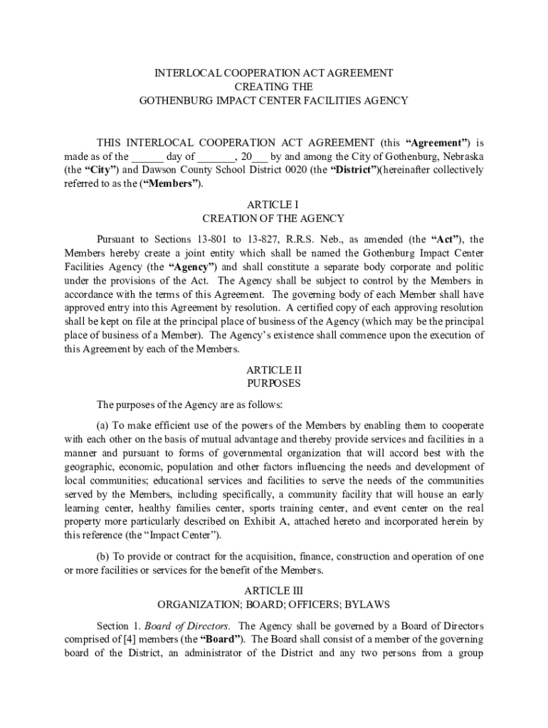 This Agreement establishes the Gothenburg Impact Center Facilities Agency, a joint entity formed by the City of Gothenburg and Dawson County School District 0020. The Agency aims to efficiently utilize resources for community services, including the construction and operation of an early learning center, sports training center, and event center through cooperation between the Members. It outlines the governance structure, funding contributions, powers, responsibilities, and procedures for the...