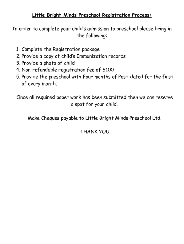 This document outlines the registration process for Little Bright Minds Preschool, including required documents, fees, and the importance of completing the registration package to secure a spot for a child. It also includes health information, emergency contacts, and photo consent details.