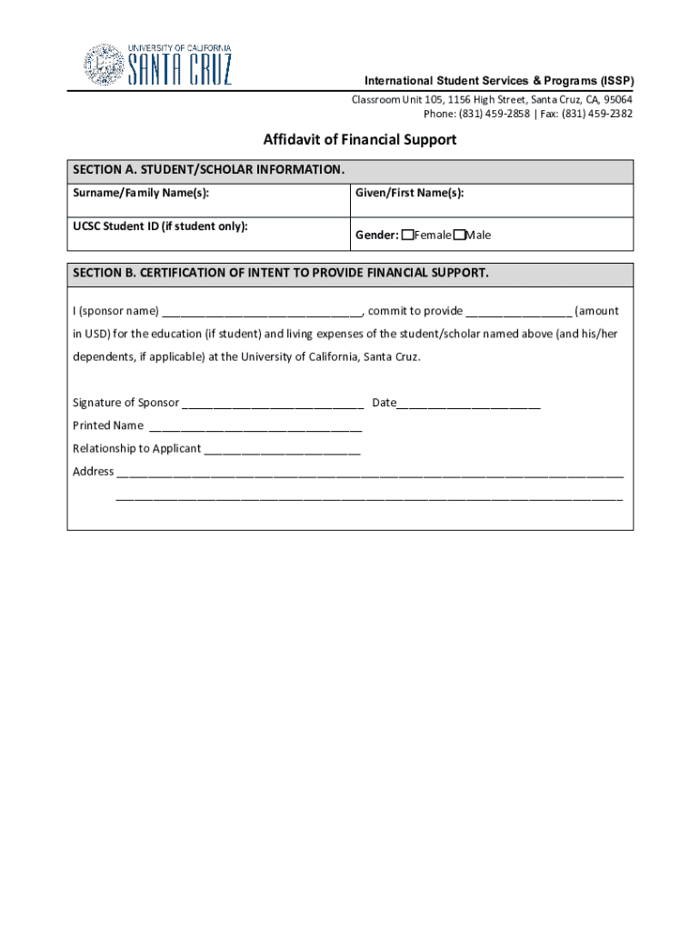 This form is used by sponsors to provide a declaration of financial support for international students attending the University of California, Santa Cruz. It requires the sponsor\'s personal information, the amount pledged for education and living expenses, and a signature to certify the commitment.