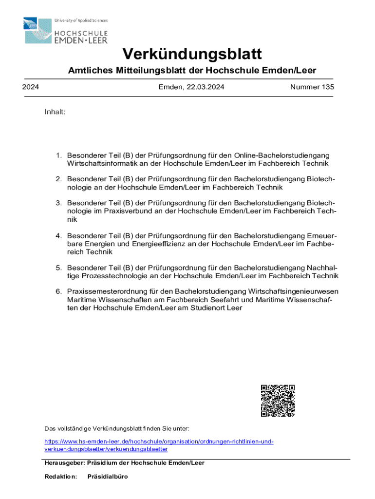 Verkndungsblatt Amtliches Mitteilungsblatt der Hochschule Emden/Leer 2024Emden, 22.03.2024Nummer 135Inhalt:1. Besonderer Teil (B) der Prfungsordnung fr den OnlineBachelorstudiengang Wirtschaftsinformatik