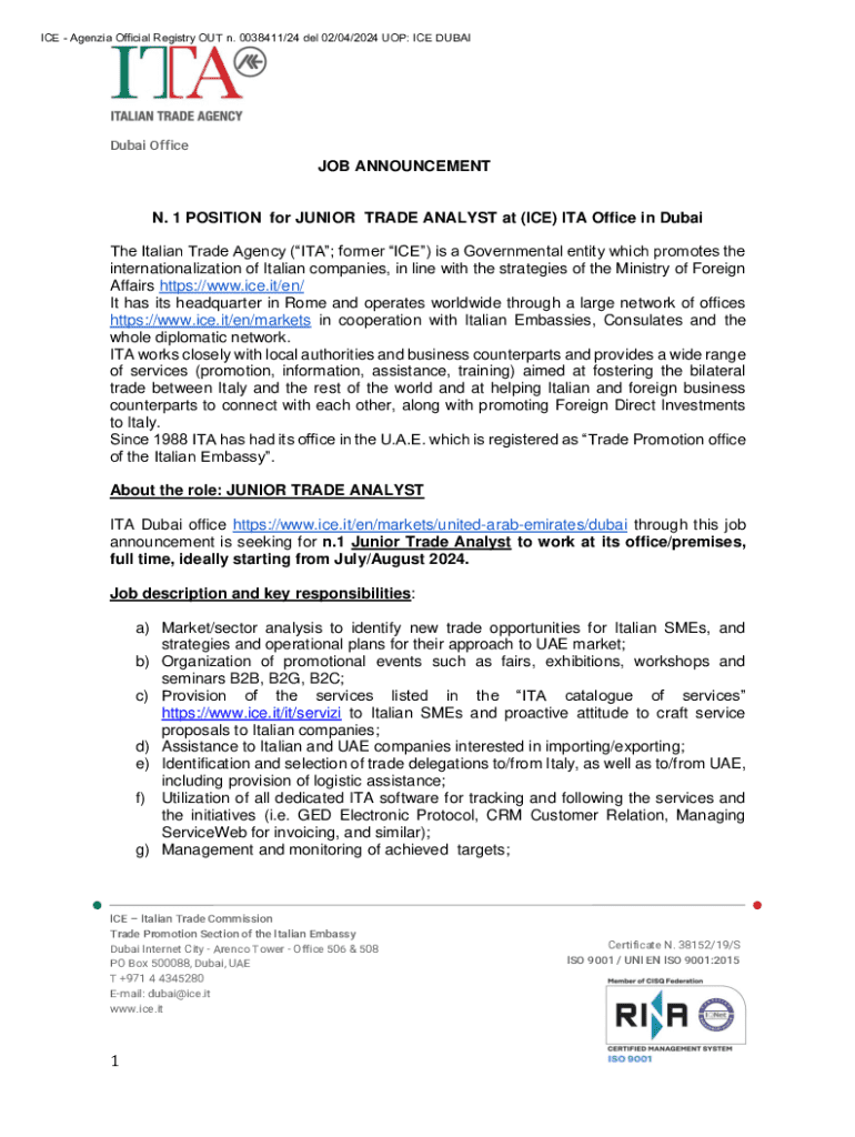 ICE Agenzia Official Registry OUT n. 0038411/24 del 02/04/2024 UOP: ICE DUBAIDubai OfficeJOB ANNOUNCEMENTN. 1 POSITION for JUNIOR TRADE ANALYST at (ICE) ITA Office in Dubai The Italian Trade Agency