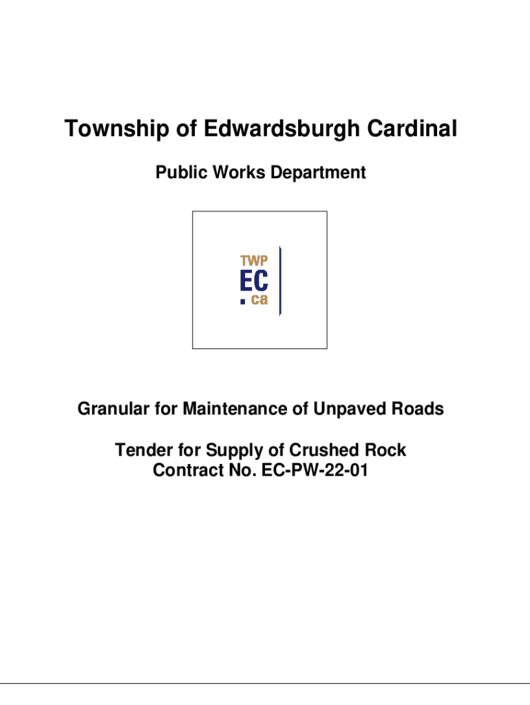 Township of Edwardsburgh Cardinal Public Works DepartmentGranular for Maintenance of Unpaved Roads Tender for Supply of Crushed Rock Contract No. ECPW2201Tender for Supply of Crushed Rock Contract