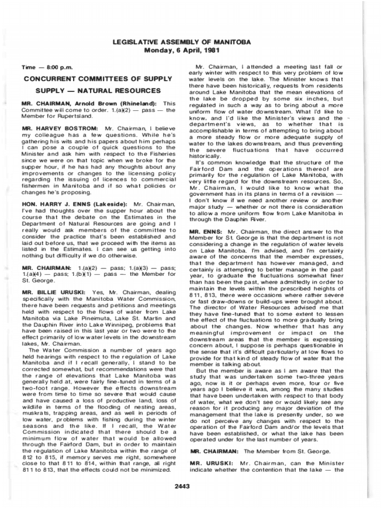 LEGISLATIVE ASSEMBLY OF MANITOBA Monday, 6 April, 1981 Time 8:00 p.m.CONCURRENT COMMITTEES OF SUPPLY SUPPLY NATURAL RESOURCES MR. CHAIRMAN, Arnold Brown (Rhineland): This Committee will come to order.