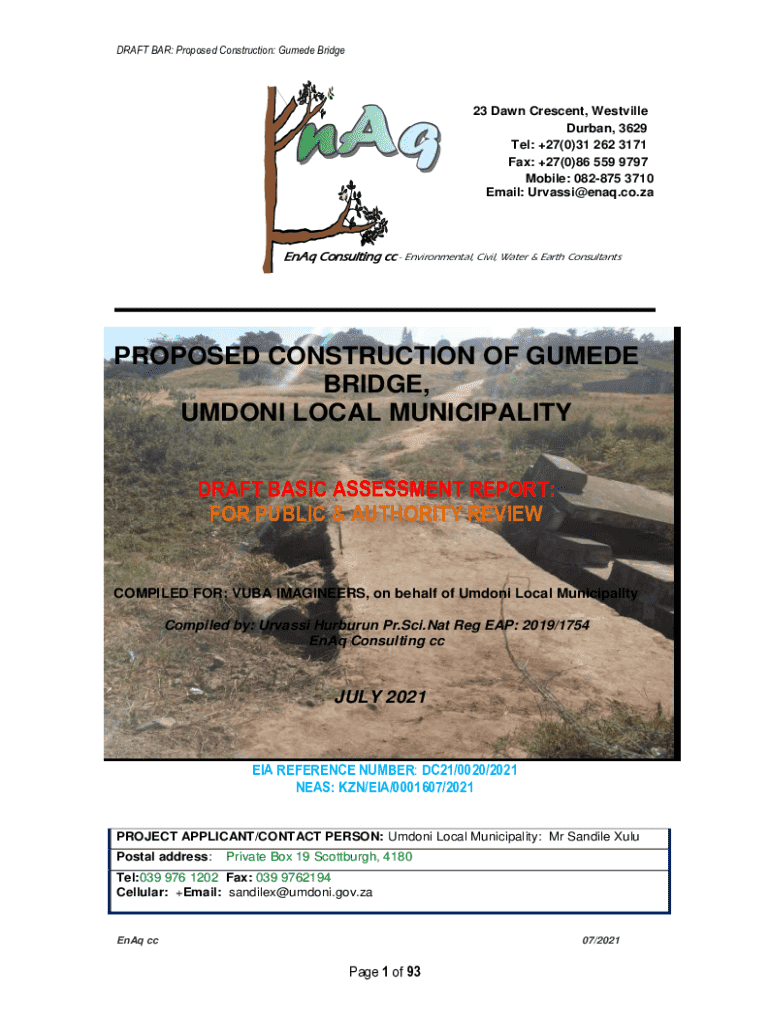 This report provides a draft basic assessment for the proposed construction of the Gumede Bridge in Umdoni Local Municipality. It outlines the environmental impacts, risks, and mitigation measures related to the project which includes reconstructing an existing storm-damaged bridge to improve public safety and access across the Gumede River.