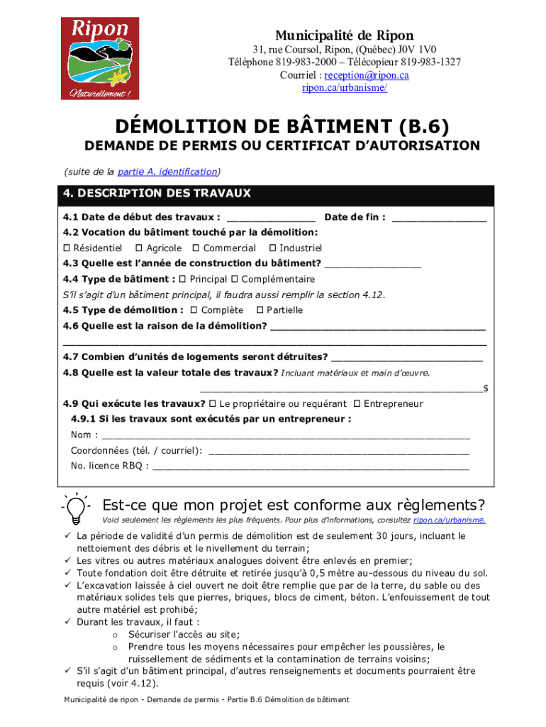 Municipalit de Ripon 31, rue Coursol, Ripon, (Qubec) J0V 1V0 Tlphone 8199832000 Tlcopieur 8199831327 Courriel : reception@ripon.ca ripon.ca/urbanisme/DMOLITION DE BTIMENT (B.6) DEMANDE DE PERMIS OU