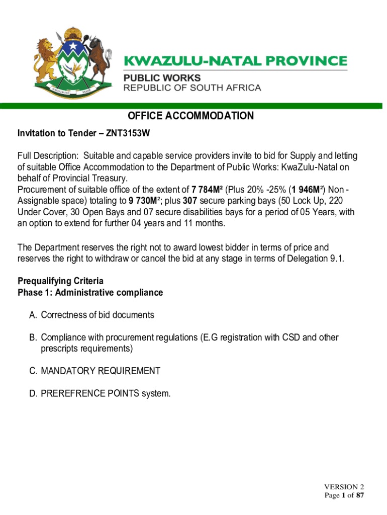 OFFICE ACCOMMODATION Invitation to Tender ZNT3153W Full Description: Suitable and capable service providers invite to bid for Supply and letting of suitable Office Accommodation to the Department