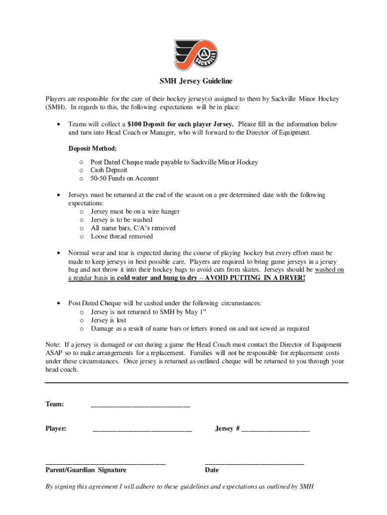 This document outlines the responsibilities and expectations for players in the care and return of hockey jerseys assigned by Sackville Minor Hockey. It includes details on deposit collection, jersey cleaning, return conditions, and procedures in case of loss or damage.