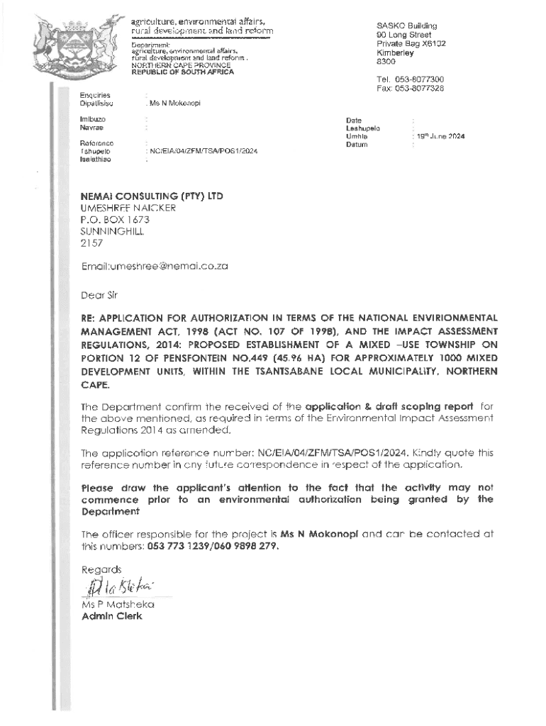 APPLICATION FORM FOR ENVIRONMENTAL AUTHORISATION File Reference Number: NEAS Reference Number: Date Received: Receipt Number:(For official use only)Application for authorisation in terms of the National
