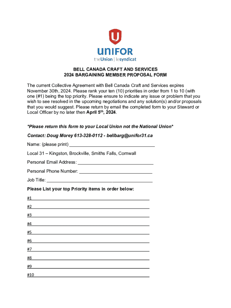 BELL CANADA CRAFT AND SERVICES 2024 BARGAINING MEMBER PROPOSAL FORM The current Collective Agreement with Bell Canada Craft and Services expires November 30th, 2024. Please rank your ten (10) priorities