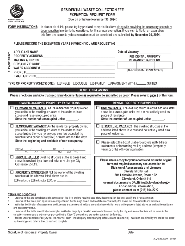 This form is for residential property owners in Cleveland seeking an exemption from waste collection fees due to vacancy or other qualifying reasons. Applicants must complete the form and submit it along with necessary documentation by November 30, 2024.